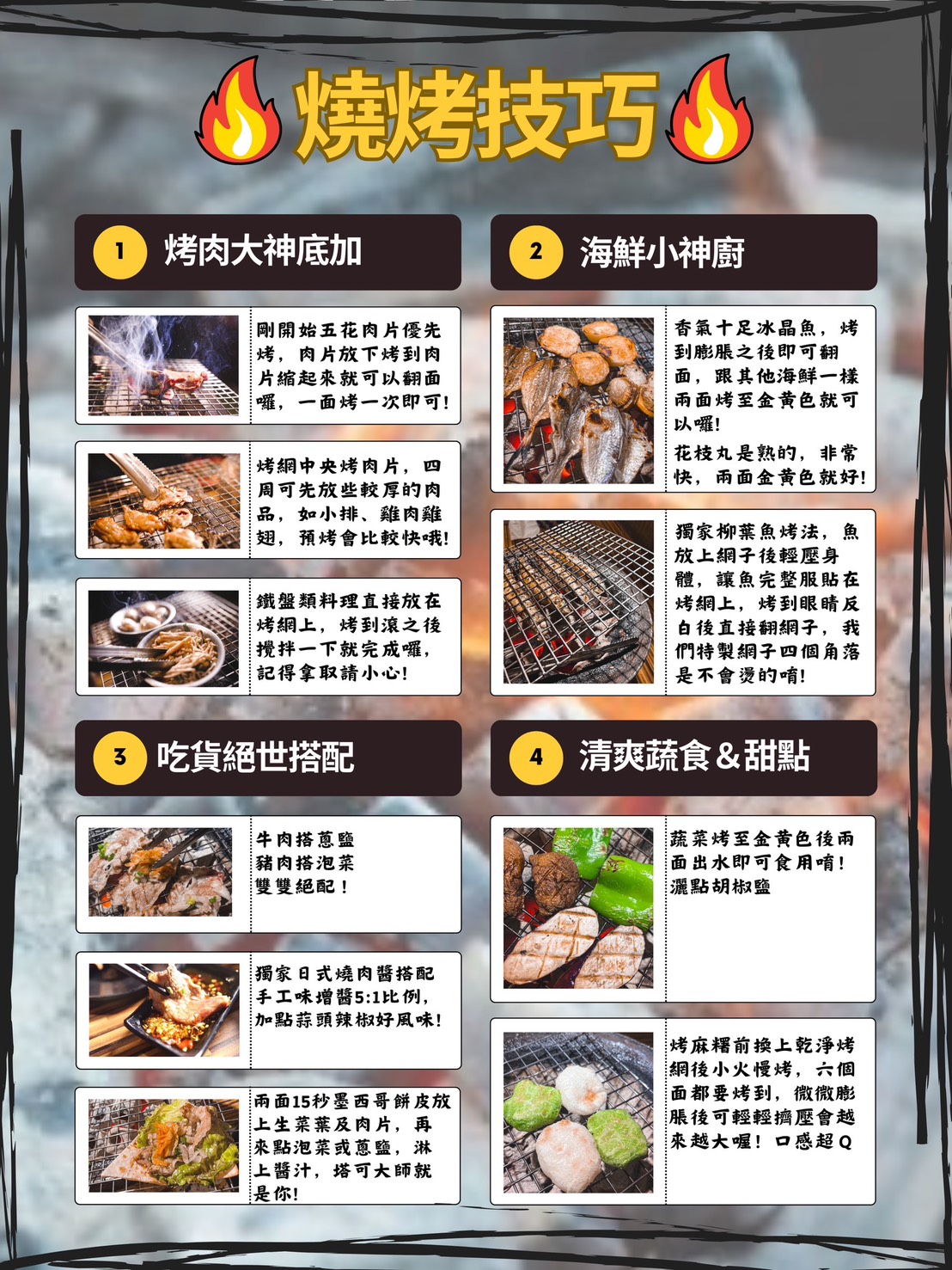 來到桃太郎燒肉,不知道該先烤哪樣?柳葉魚老是黏網?別擔心!為了讓每一片肉、每一道海鮮都能發揮 100% 的極致風味,我們特別準備了這份**「燒烤攻略」**。 我們把客人在店裡最常遇到的問題,通通整理成這張超好懂的「燒烤技巧圖」。